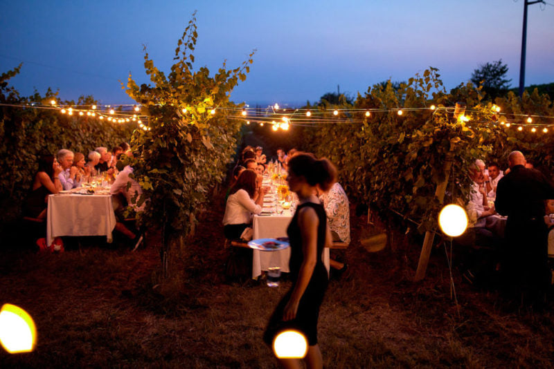 Avevamo pensato a una sera d'Estate: quando il sole tramonta, i colori della giornata lasciano il posto alle ombre avvolgenti delle candele, e iniziano a brillare le luci nella pianura all'orizzonte. Immaginavamo una cena immersa nel verde delle vigne, con le note di un complesso jazz in sottofondo, per brindare insieme dove nascono le nostre bollicine.